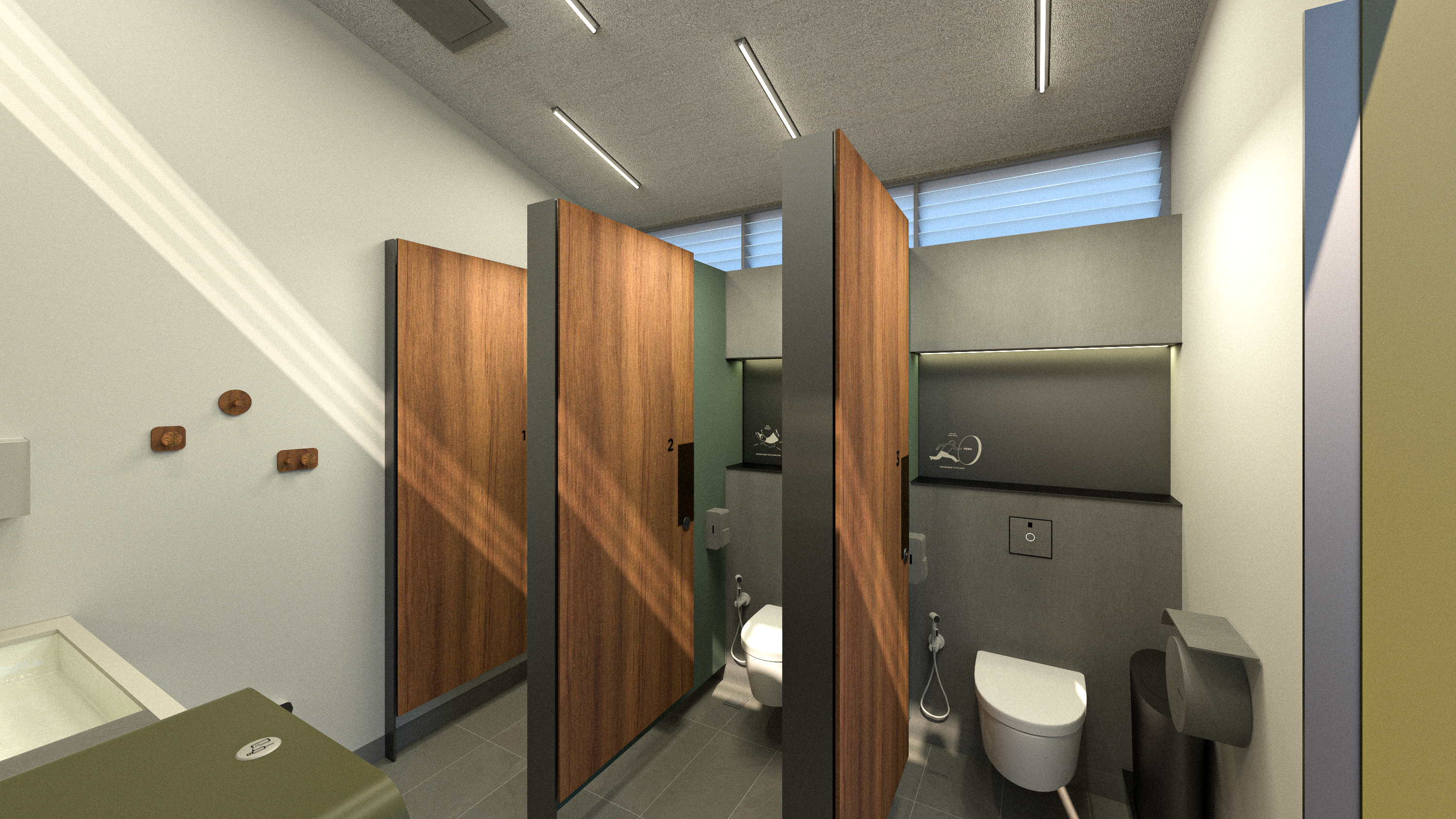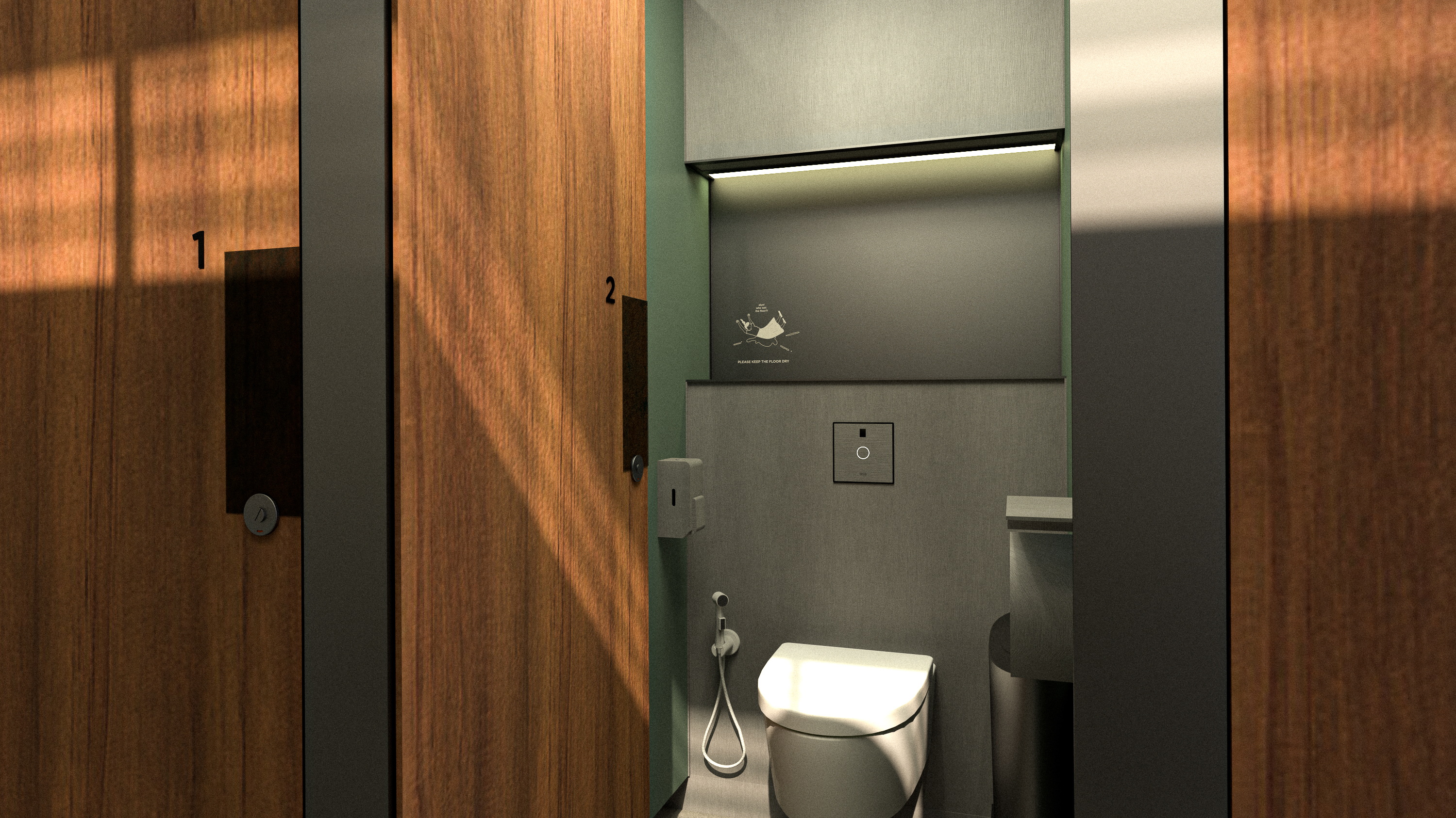 The design places a strong focus on the experience of using a public bathroom. With the strong influx and exchange of users in a post pandemic world, the design needs to redefine the ways we utilise this space. We began by firstly empathising with the cleaners who maintain the space daily, simplifying various corners and surfaces. In addition, we focused on the ambience when using the cubicles, providing an atmospheric yet functional setup.